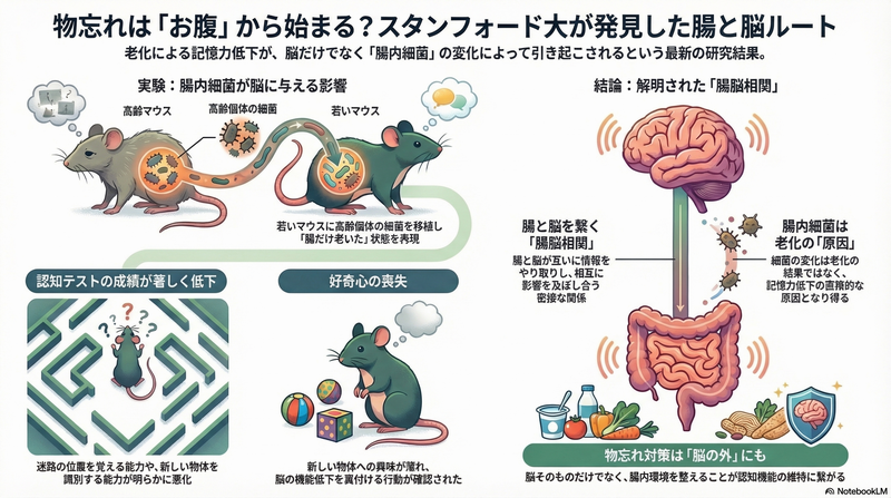 スタンフォード大学の研究チームは、老化に伴う記憶力の低下が腸内細菌の変化によって引き起こされる可能性をマウス実験で明らかに