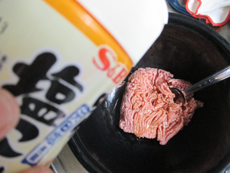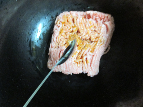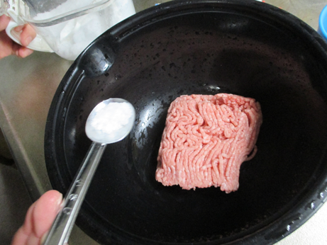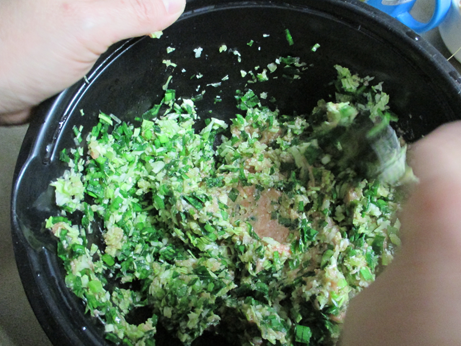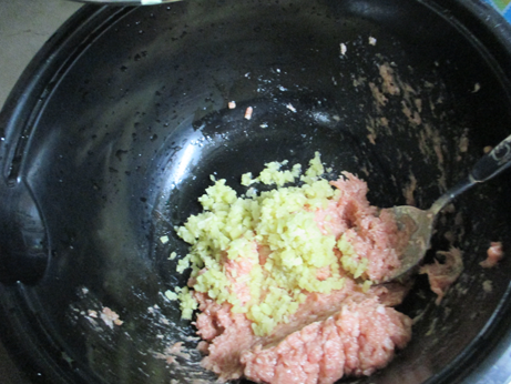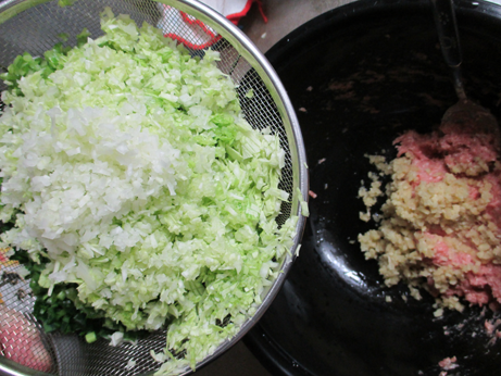 4.みじん切りのキャベツ、ニラ、生姜を合流させます