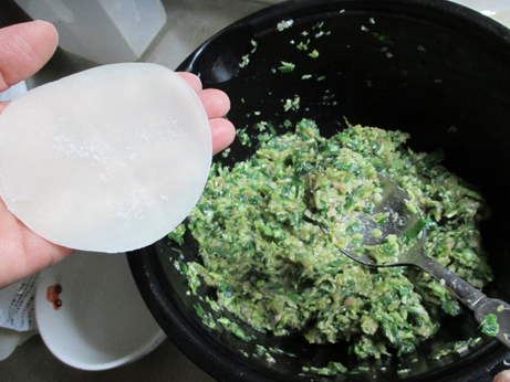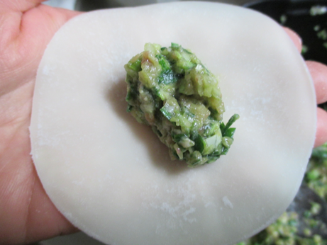 5.桜えび1匹とアサリむきみ1つも入れて皮に包みます