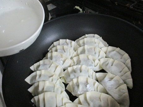 6.オリープオイルをひいて包んだ餃子を並べ、焼きます